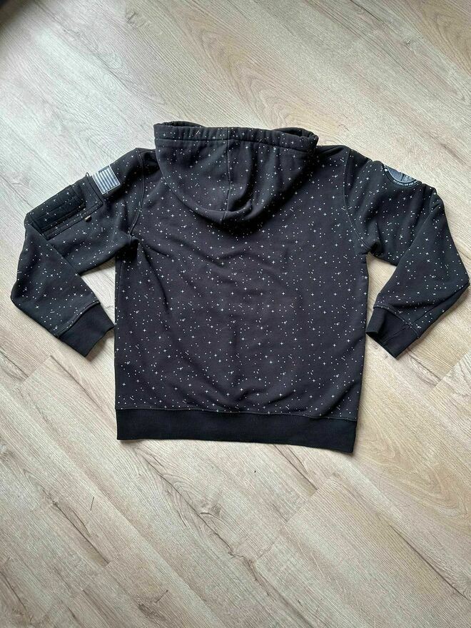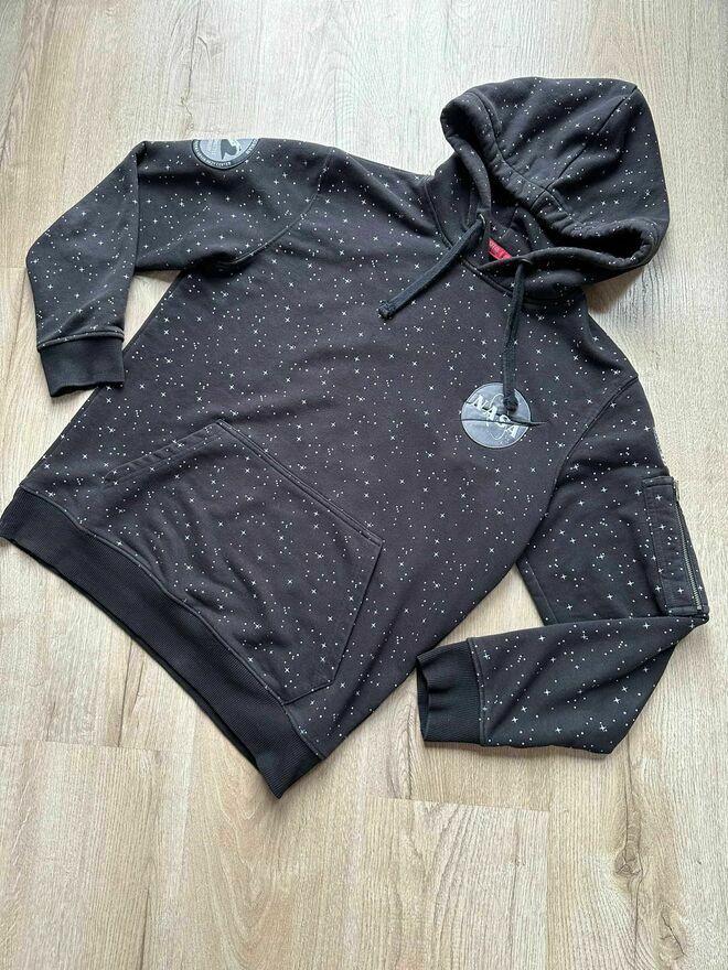 Męska bluza z kapturem marki Alpha Industries w rozmiarze M. Kultowy model z logo NASA na piersi i naszywką flagi USA na rękawie. Wzór przypominający gwiazdy na całej powierzchni. Kieszeń typu kangurka i klasyczna kieszeń zapinana na suwak na rękawie. Stan bardzo dobry – brak uszkodzeń, lekko spranaIdealna dla fanów kosmosu i stylu streetwear. Oryginalna i stylowa.