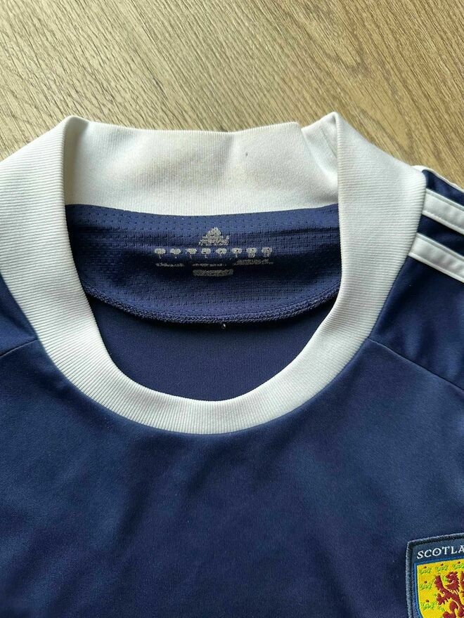 Oferuję oryginalną koszulkę piłkarską reprezentacji Szkocji marki Adidas w technologii ClimaCool. To wyjątkowy, kolekcjonerski model z 2007 roku, używany przez kadrę narodową podczas eliminacji do Euro 2008.Koszulka w kolorze granatowym z białymi akcentami, posiada duży tłoczony herb ze szkockim lwem na froncie oraz haftowany herb Scottish FA na piersi. Z boku widoczne logo ClimaCool, a na dole oryginalna wszywka Adidas Authentic.