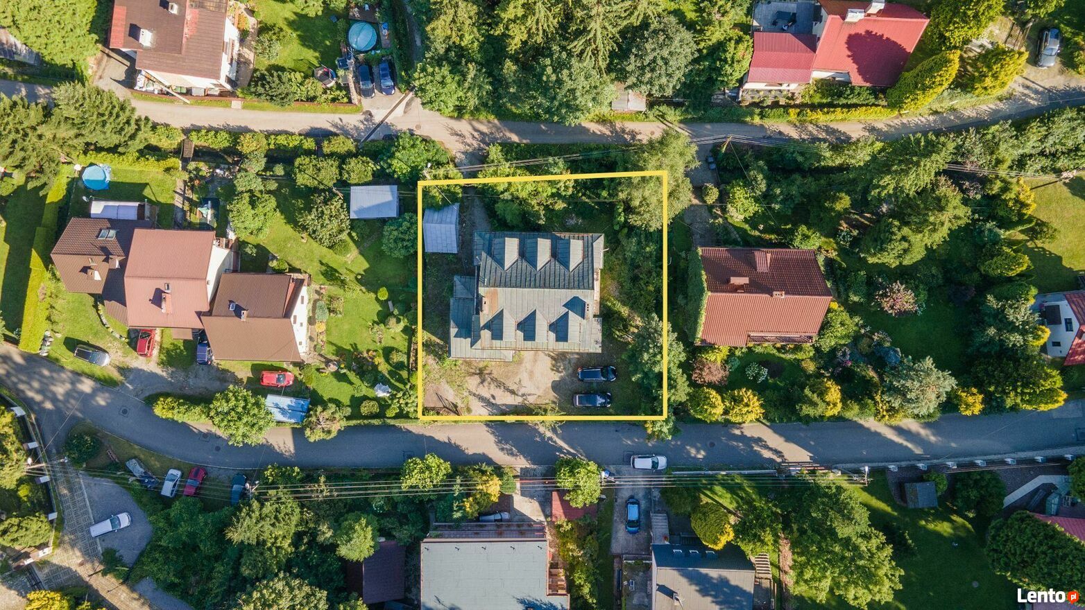 Posesja jest całkowicie ogrodzona, większość działki jest wyłożona kostką brukową, w ogródku rosną drzewa i krzewy ozdobne.