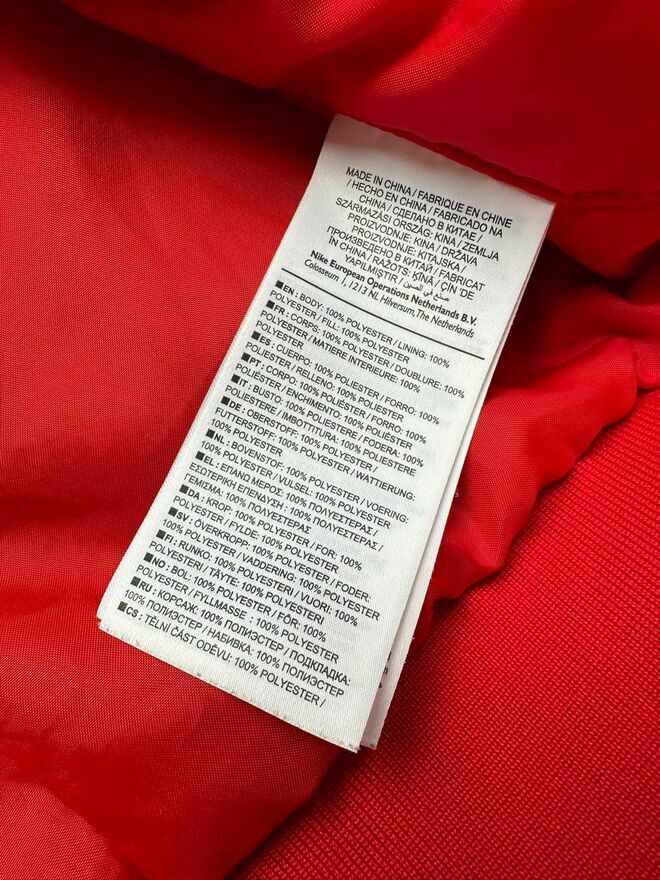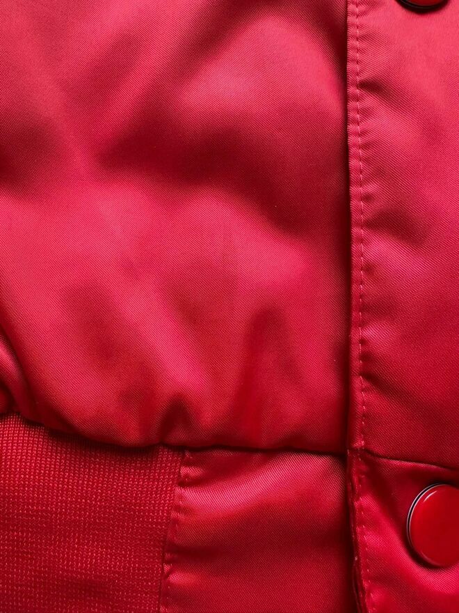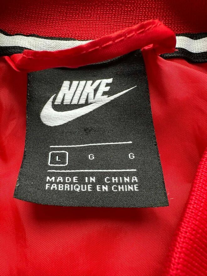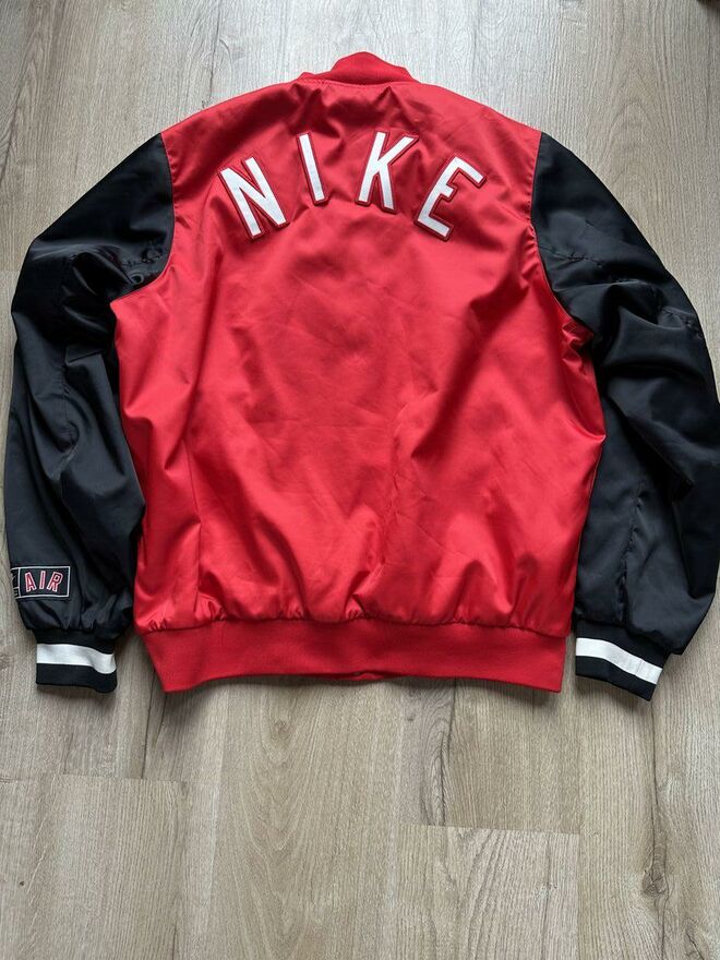 Oryginalna męska kurtka Nike Air Varsity Jacket w rozmiarze L. Model w stylu baseballowym, w kolorze czerwonym z czarnymi rękawami, z logo Nike Air na rękawie i dużym napisem NIKE na plecach. Kurtka zapinana na zatrzaski, posiada elastyczne ściągacze w pasie i przy mankietach dla lepszego dopasowania.Świetna propozycja dla fanów streetwearu i sportowego stylu – pasuje zarówno na co dzień, jak i do casualowych stylizacji.