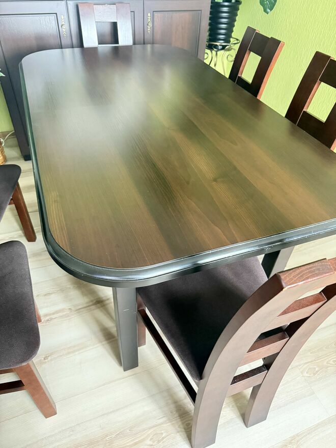 Sprzedam rozkładany stół 1600cm / 90 cm w kolorze ciemny brąz6 tapicerowanych krzeseł w tym samym kolorze.